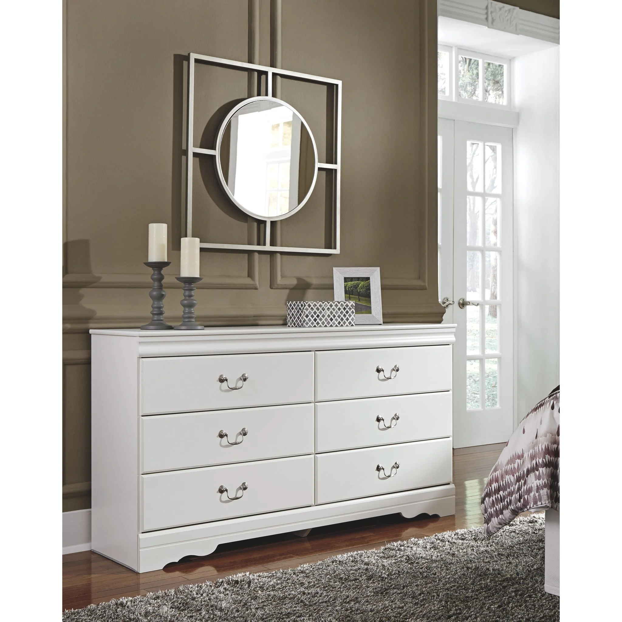 The Anarasia dresser's crisp cottage white gives traditional Louis Philippe profiling a delightful style awakening. The look is timeless. The feel? Right at home. Six smooth-gliding drawers with antiqued bail pulls beautifully accommodate.