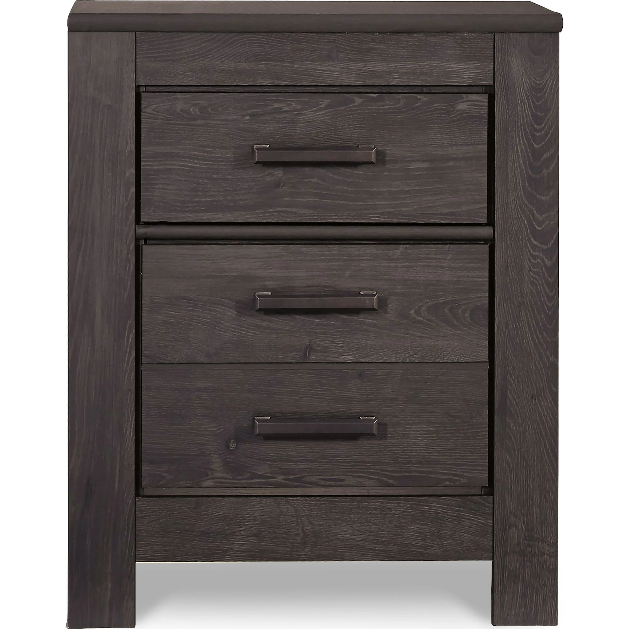 Priced to entice and styled to impress, the Brinxton nightstand is urban sophistication with a decidedly relaxed air. It’s got the crisp, clean lines of a contemporary piece, but with an earthy element. Replicated oak grain effect gives the chic charcoal finish warmth and character. Linear pulls are a sleek touch.