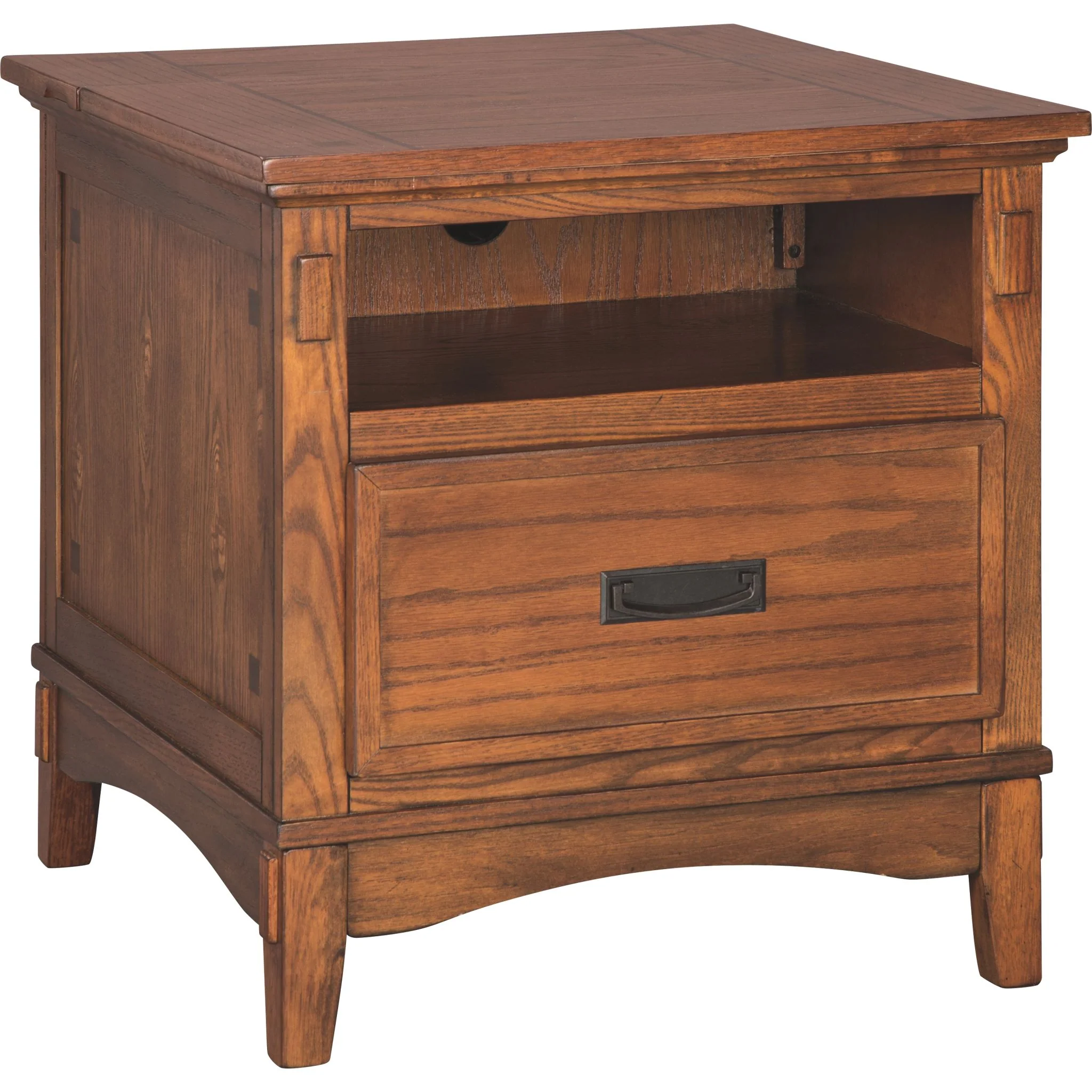 A look that's right in line with timeless Mission design. Cross Island end table also marries form with functionality: an open cubby sits atop the spacious drawer. Built-in power strip increases your electrical connectivity.