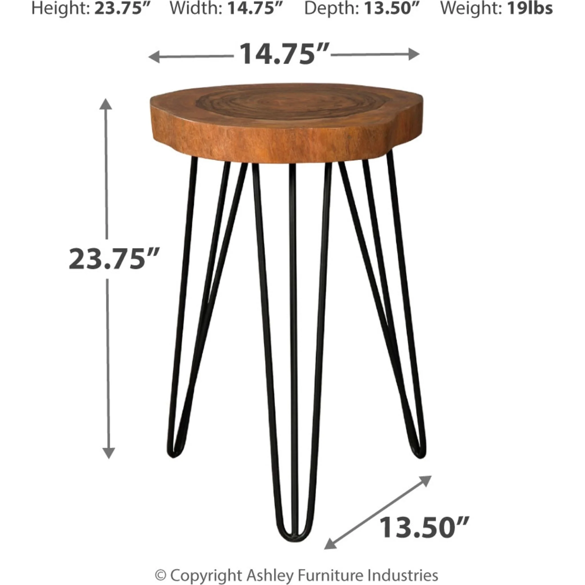 Our secret is simple--natural style. This accent table flawlessly merges natural finished wood with angular black finished metal legs. Faux live edge on the tabletop pushes boundaries to bring the outside inside.