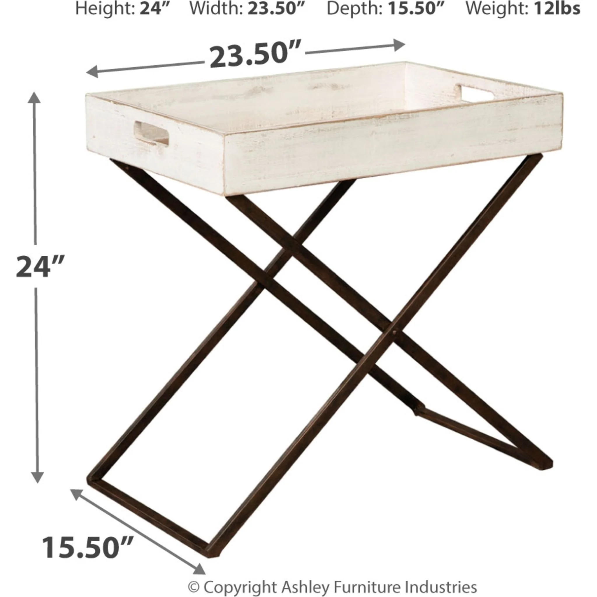 Casually cool style served with a side of bygone charm. Pairing solid wood and metal, this accent table with “tray” top commingles a distressed aesthetic with clean-lined, modern appeal. Combination of three finishes gives this simply striking table so much distinction.