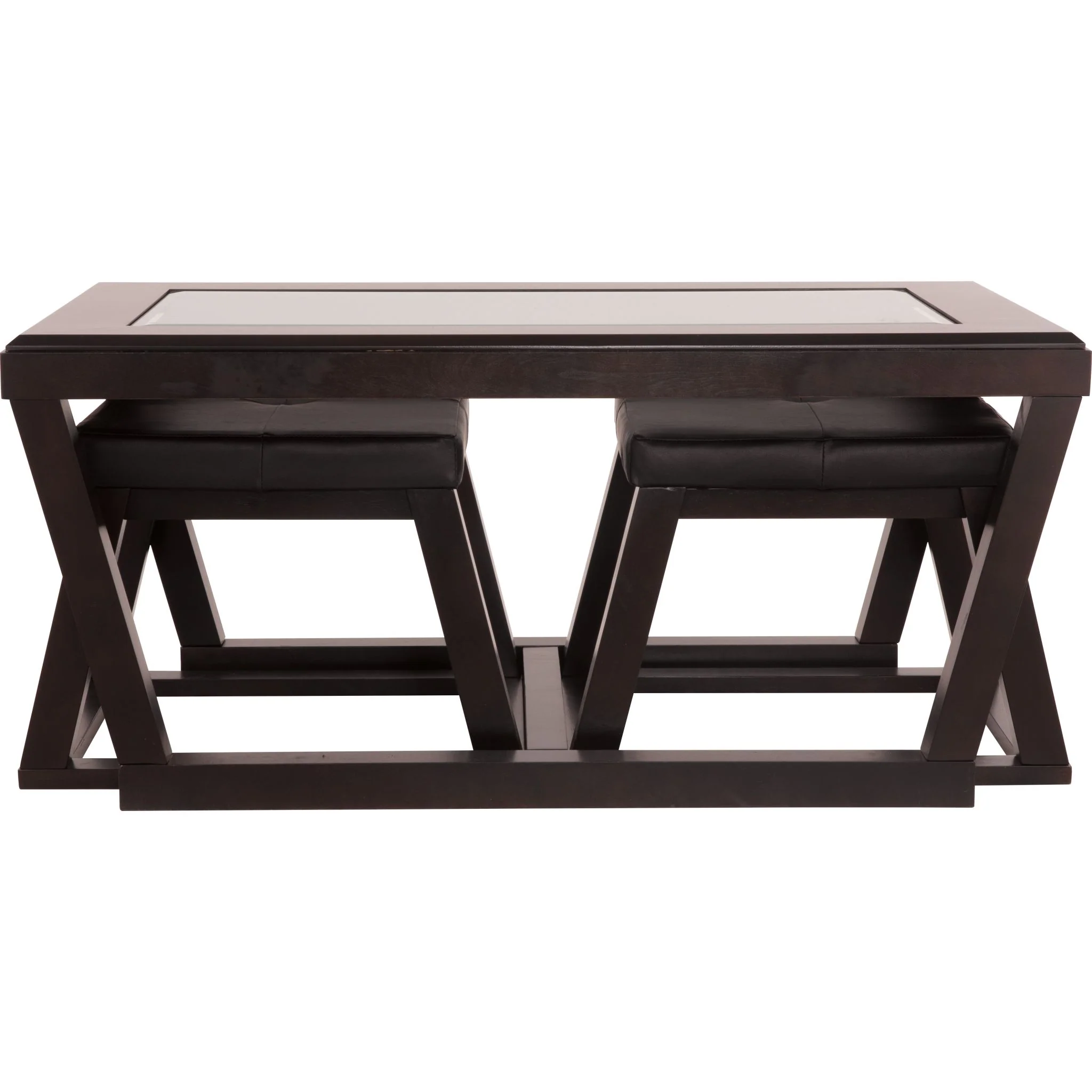 Kelton coffee table with stools sits beautifully with those looking for multi-functionality from their contemporary furnishings. Two nesting ottomans, upholstered in faux leather, provide handy informal seating and a comfortable place to kick up your heels.
