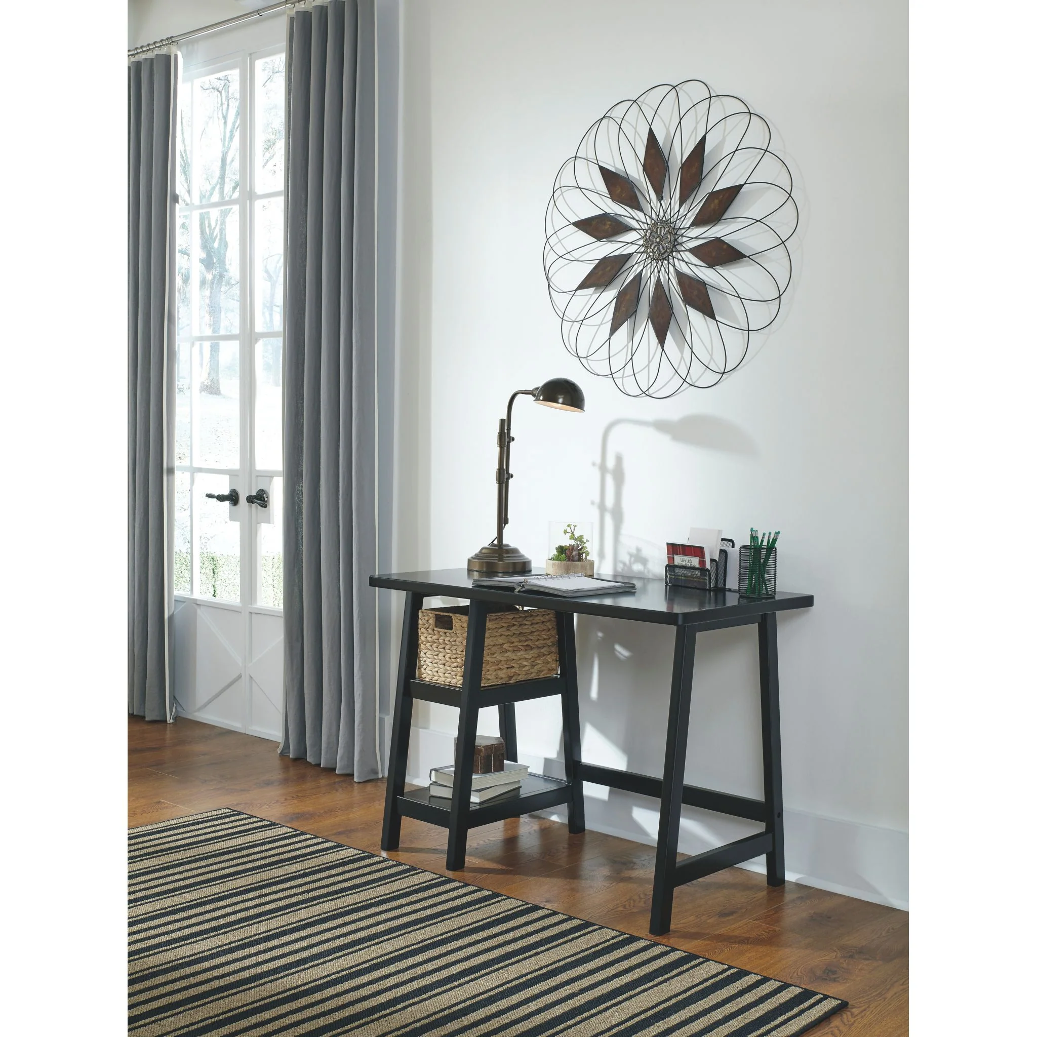 Space-challenged rooms call for simply chic style: like the Mirimyn small home office desk in black. Clean and lean, this desk’s classic trestle design always works. Pair of open shelves and natural water hyacinth basket provide essential storage.