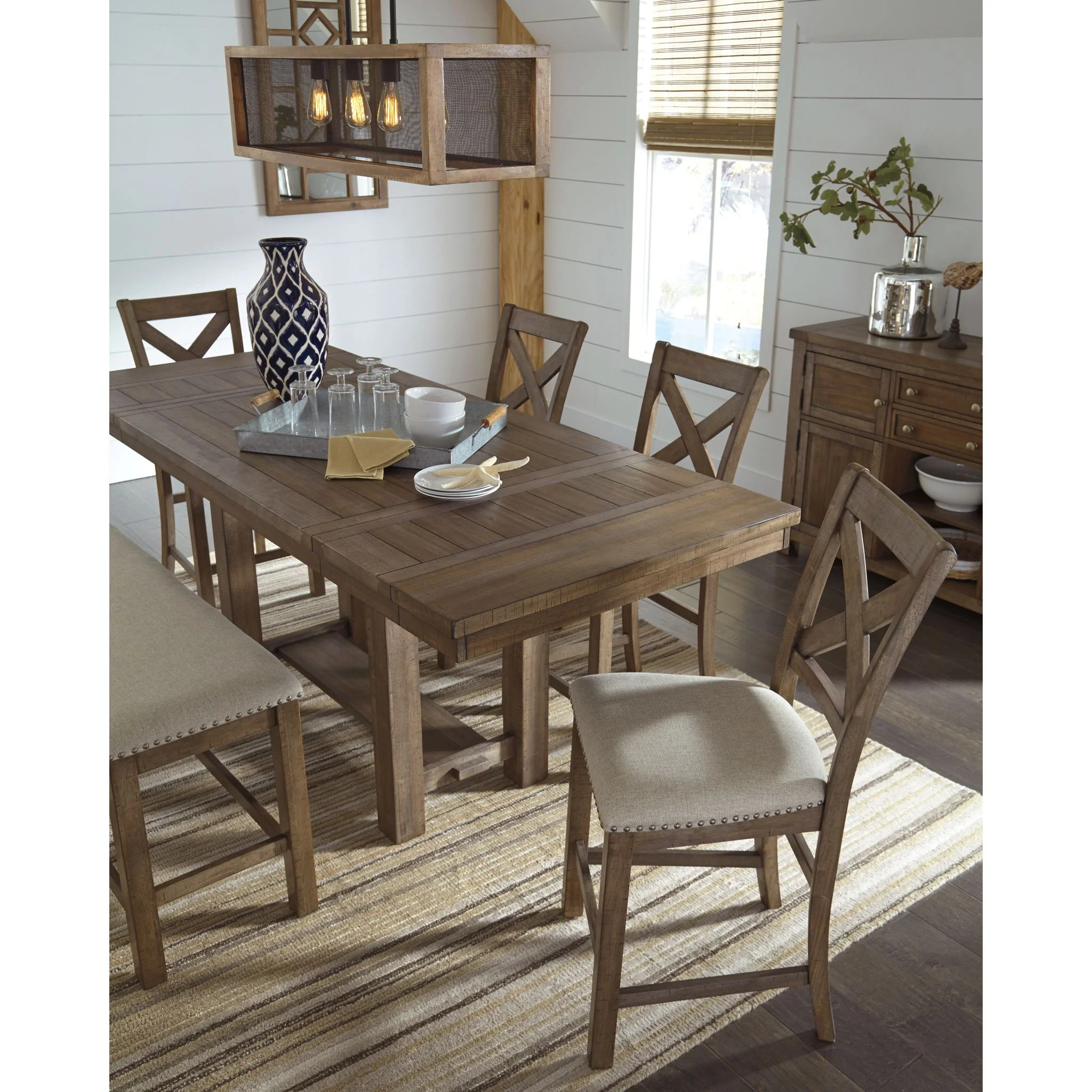 The Moriville upholstered bar stool might be simple at first sight, but a closer look reveals beauty in the details. With a distressed nutmeg finish, antiqued nailhead trim and textured polyester upholstery, it’s beaming with charm. Cushioned seat ensures long, lingering meals are enjoyed in comfort.