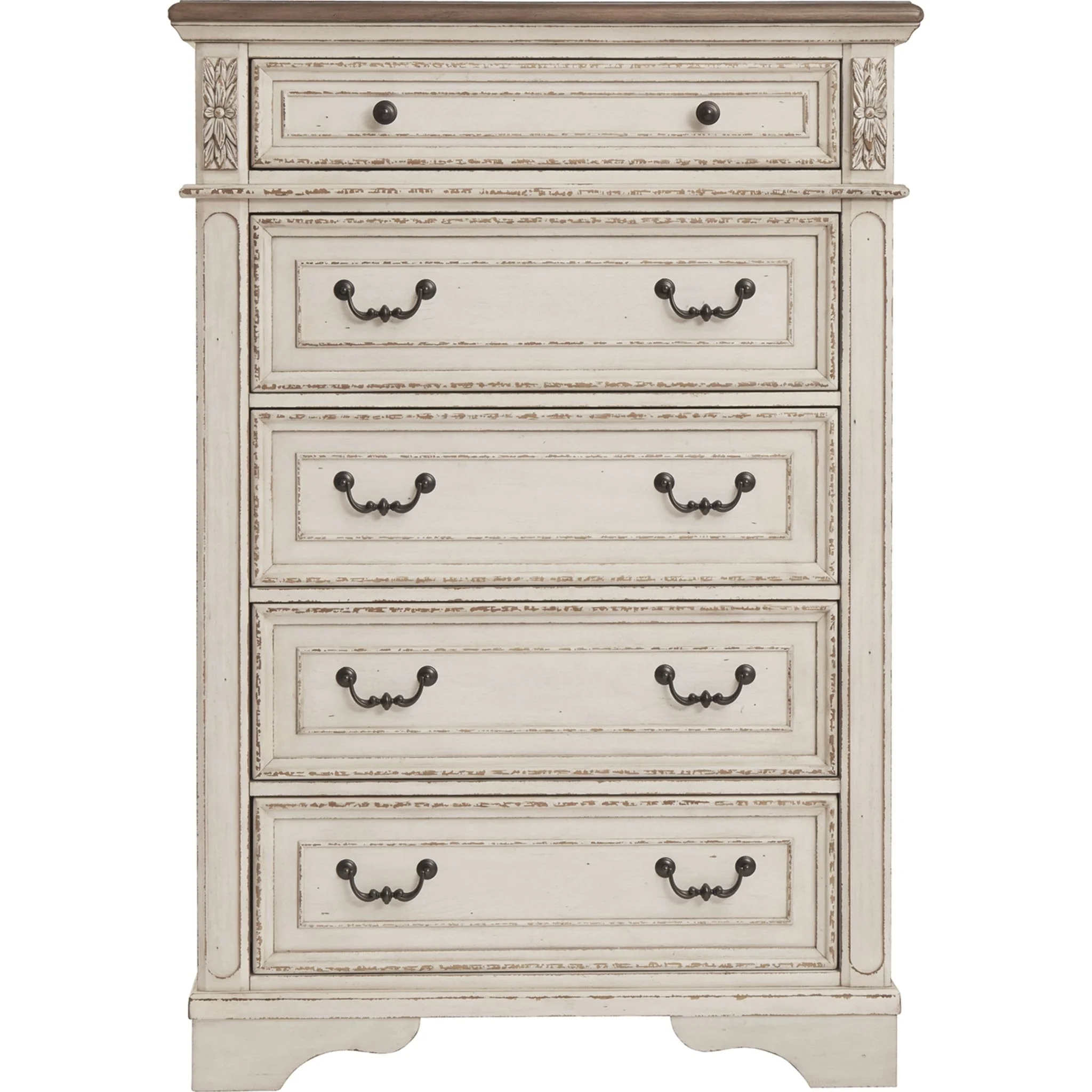Elevating the art of traditional cottage styling, the Realyn chest of drawers is your dream bedroom retreat realized. Its antiqued two-tone aesthetic blends a chipped white with a distressed wood finished top for added charm. Framed drawer fronts and decorative corbels add refinement, while bail pulls in a dark bronze-tone finish lend a classic touch.