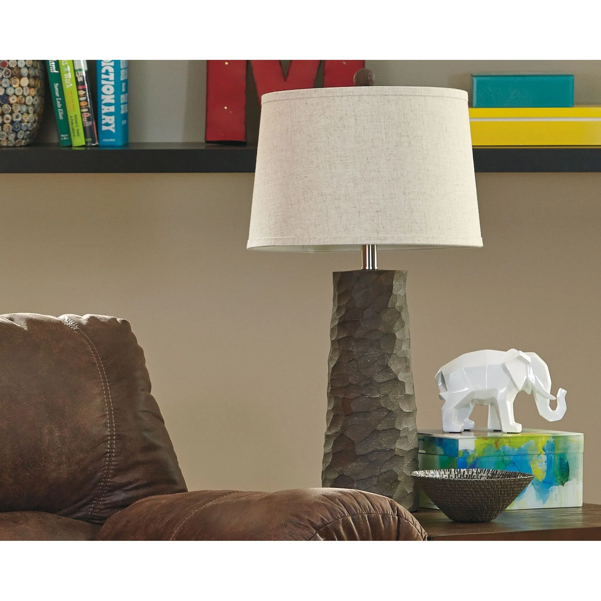 Tickled by texture? If there’s a lighting collection that illuminates textural beauty, it’s these table lamps. The carved faux wood multi-tone base exudes an earthy vibe, while the veined linen-look shade is the essence of light and airy.