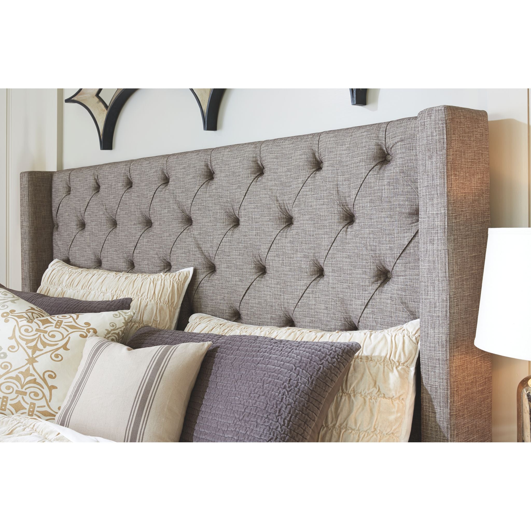 To create this masterpiece, we transformed the glamour of yesteryear into something fresh and new. The Sorinella bed sets a high note for affordable luxury, with diamond tufting highlighting the upholstered wing headboard. Platform footboard is beautifully upholstered, too.