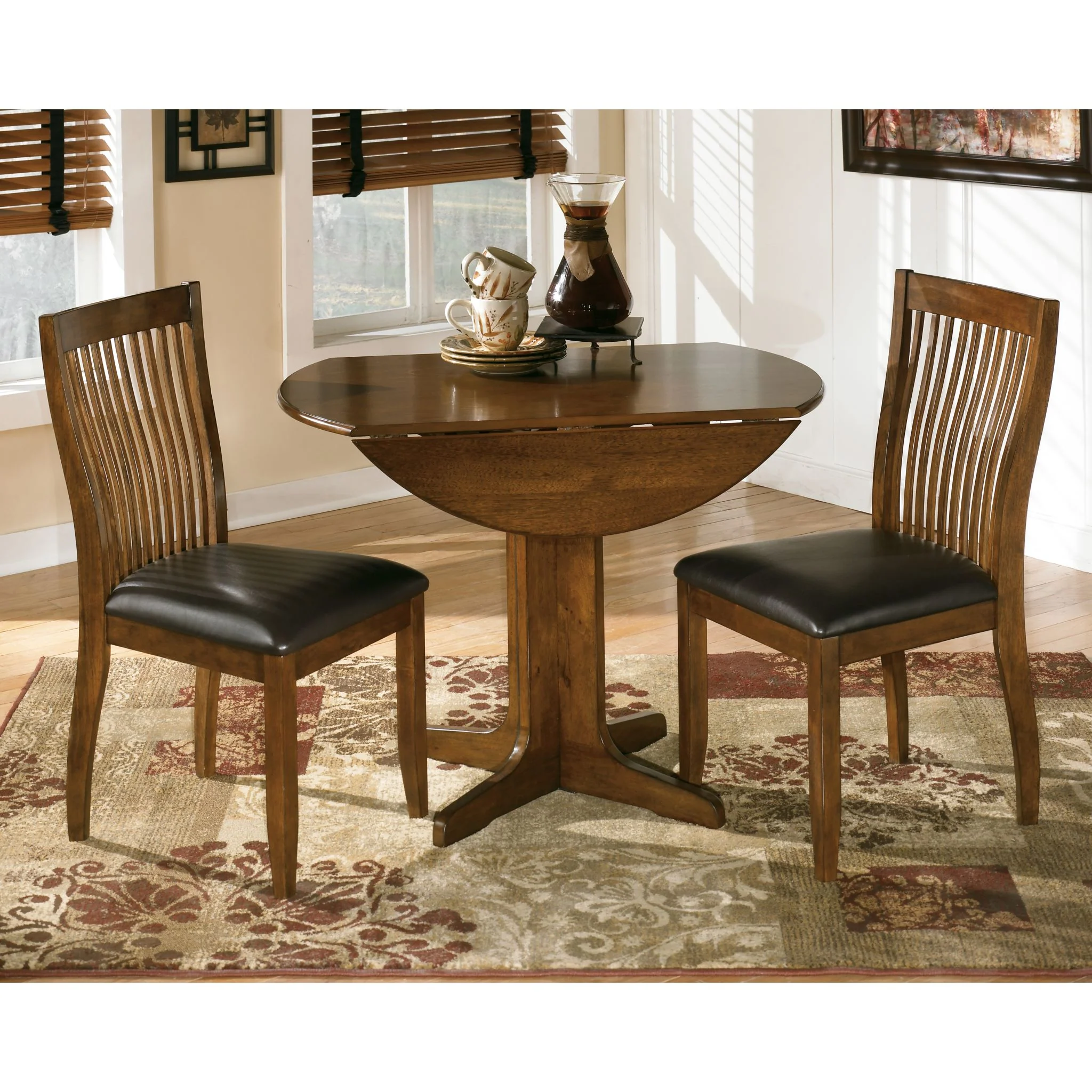 Stuman round dining room table offers those short on space nice leeway. When friends or family drop in, raise the drop-down leaves for ample tabletop space.
