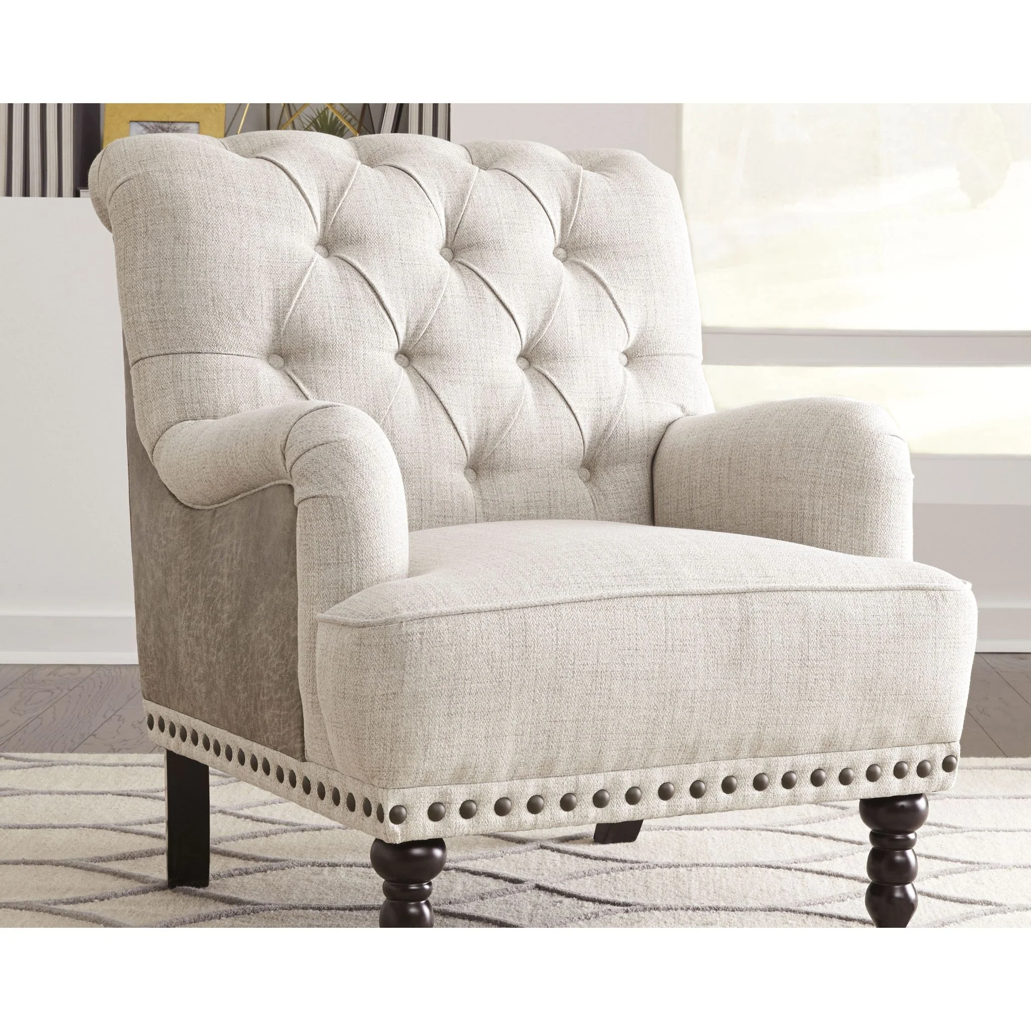 Fresh and sophisticated. The Tartonelle accent chair with button tufting is a classy addition to your home. Inside-out design with linen weave fabric on the seating area and taupe faux leather on the back. Large nailhead trim ties the look together. Charles of London arms and turned bun feet make this a stylish heirloom piece.
